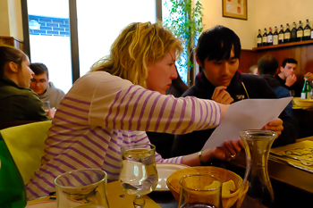 For today’s lunch we visit a small family-run restaurant around the corner from our apartment. We score the spacious back room nearly to ourselves while a couple of waiters lounge in the front room, nursing espressos. I’m about to comment to Jim about the peaceful environment when 25 Bostonian high schoolers and teachers swarm the place, enveloping us. The teens order beer and carafes of red and white wine. Minors can order minor alcohol at age 16 but must wait until 18 to order harder stuff. We’re in Italy.