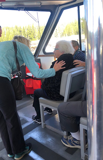 We departed a few minutes late to allow Mary Frances, her walker, and her entourage to load first on the boat, like Platinum members on Delta. The captain announced that Mary Frances was celebrating her 93rd birthday today, and we all cheered. Her family takes her to a different National Park each summer, most recently to Denali in Alaska.